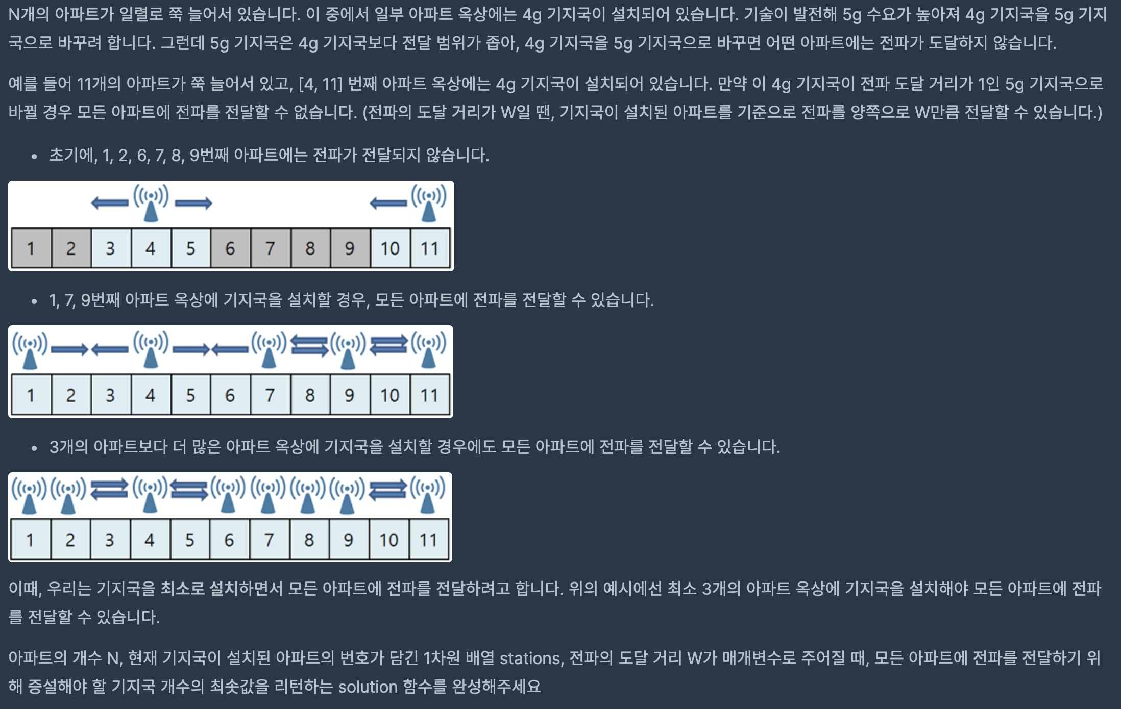 [Programmers] Lv3. ๊ธฐ์ง๊ตญ ์ค์นSW Test/Programmers 2020. 9. 19. 04:16๋ฐ์ํ