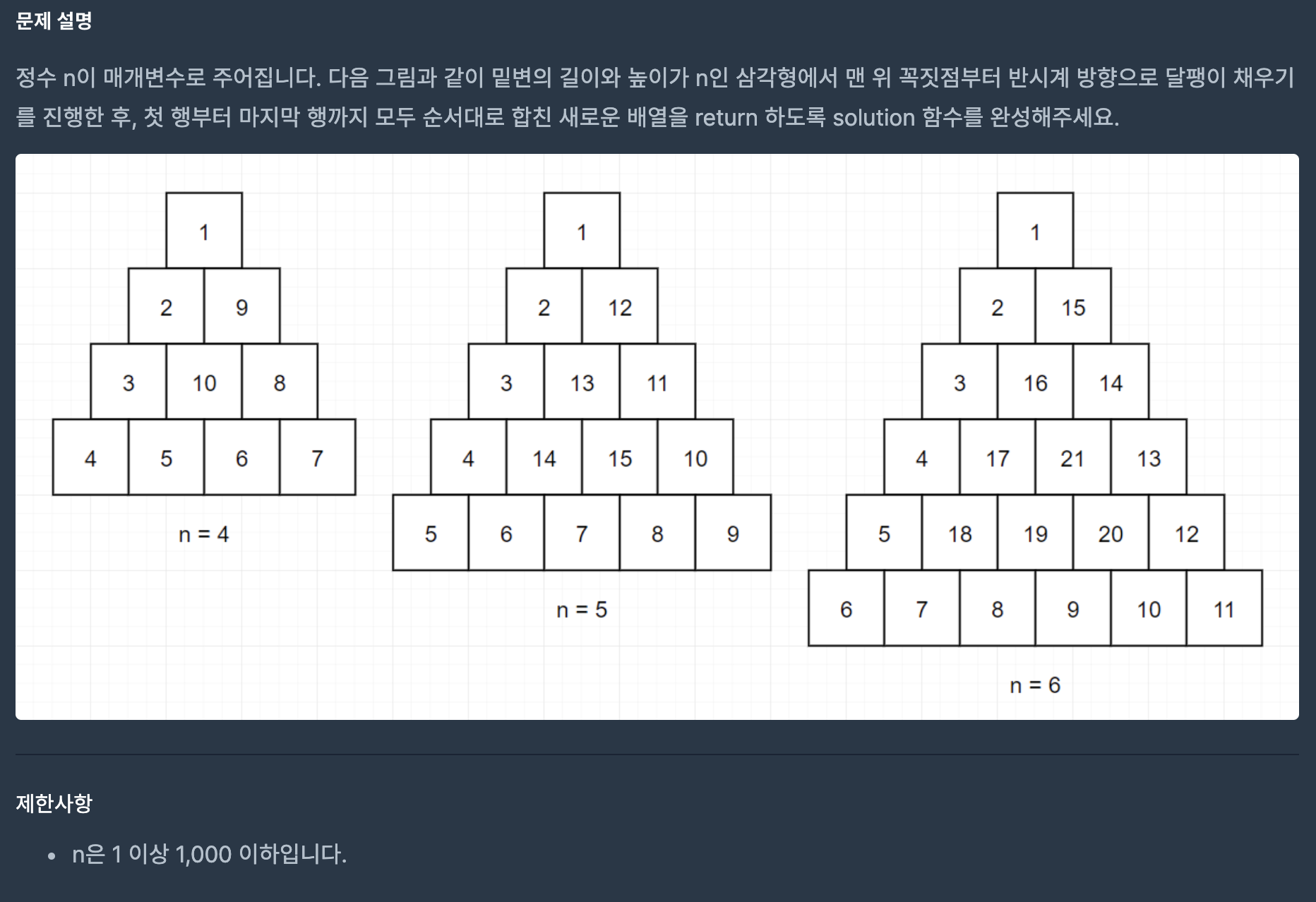 [Programmers] Lv2. ์ผ๊ฐ ๋ฌํฝ์ดSW Test/Programmers 2020. 10. 18. 23:51๋ฐ์ํ
