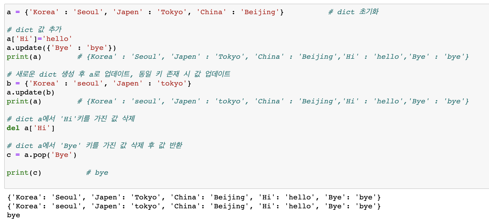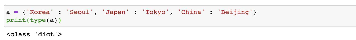 Dict์ ์ด๊ธฐํ : { key : value , key2, value2, ... }์ ๊ฐ์ด ํค์ ๊ฐ์ ๋ด์์ ์์ฑ