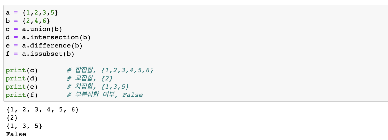 ์ํ์งํฉ์ ์ฐ์ฐ๊ณผ ๋์ผํ๊ฒ ์ฌ์ฉ ๊ฐ๋ฅ : union(), intersection(), difference(), issubset()