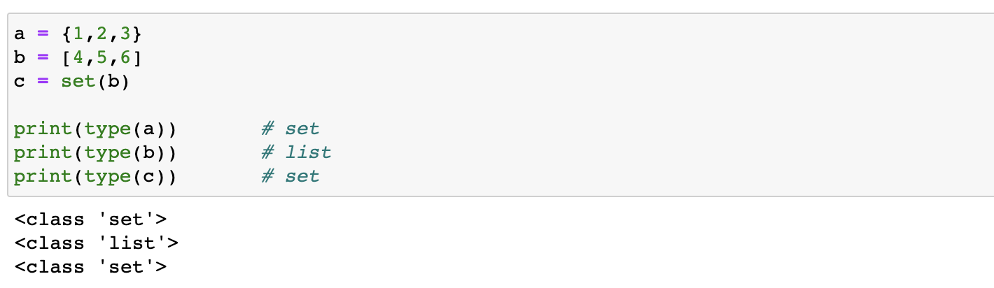 Set์ ์ด๊ธฐํ : { value, value2, value3 }์ ๊ฐ์ด ๊ฐ์ ๋ด์ ์์ฑ, set()ํจ์๋ก ์งํฉ์ผ๋ก ๋ณํ