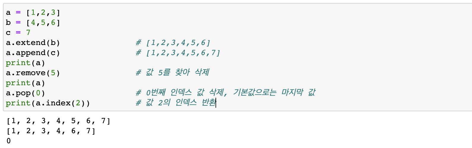 ๋ค์ํ ๋ฆฌ์คํธ ๋ฉค๋ฒํจ์ ์กด์ฌ : append(), extend(), insert(), remove(), pop(), index() ...