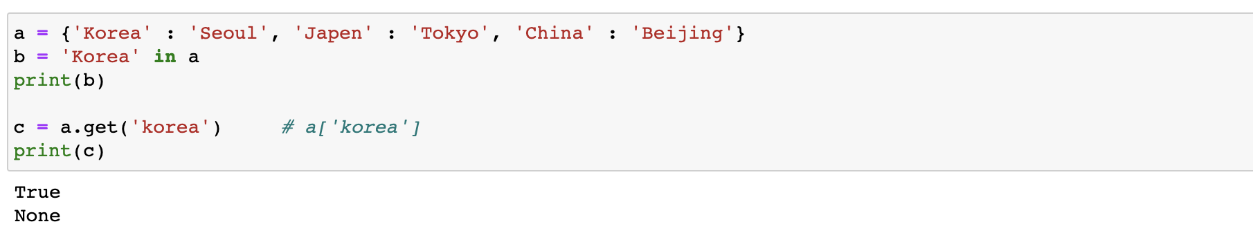 dict[key]๋ก ๊ฐ ์ ๊ทผ, ํค๊ฐ ์๋ ๊ฒฝ์ฐ ์๋ฌ ๋ฐ์, ์๋ฌ๋ฅผ ๋ฐฉ์งํ๊ธฐ ์ํด์๋ get()ํจ์ ํธ์ถ