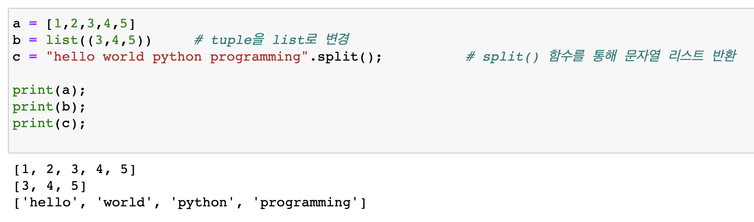 List๋ฅผ ์ด๊ธฐํ : []์ ๊ฐ์ ๋ด์์ ์์ฑ, list() ํจ์๋ก ์์ฑ, string.split() ํจ์๋ก ์์ฑ
