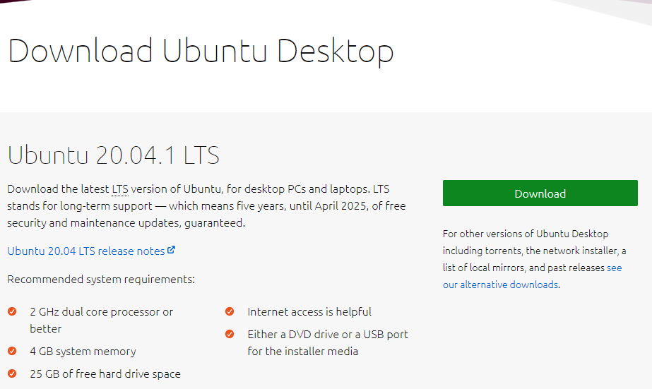 - Ubuntu ๊ณต์ ํํ์ด์ง[https://ubuntu.com/download/desktop] ๋ฅผ ํตํด Ubuntu ISO ์ด๋ฏธ์ง ํ์ผ์ ๋ค์ด๋ก๋ ๋ฐ์ต๋๋ค.