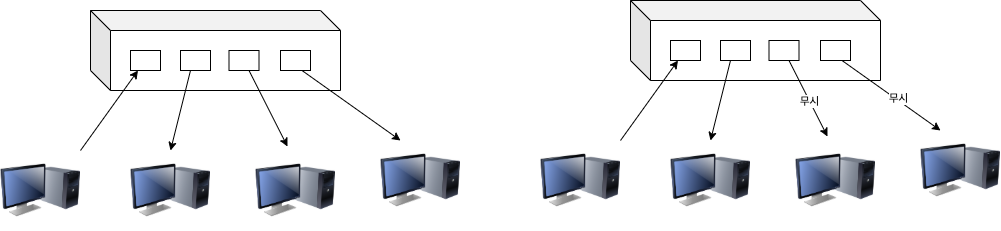 - ํ๋ธ๋ 1๋ฒํฌํธ๋ก ์์ ํ๊ณ ๋๋จธ์ง ๋ชจ๋ ํฌํธ๋ก ์ ์กํ์ง๋ง ๋ชฉ์ ์ง์ MAC์ฃผ์์ ๋ค๋ฅธ ์ปดํจํฐ์์๋ ๋ฐ์ดํฐ๋ฅผ ๋ฌด์ํ๊ฒ ๋ฉ๋๋ค.