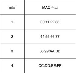 ์ค์์น ๋ด๋ถ์๋ MAC ์ฃผ์ ํ ์ด๋ธ์ด ์กด์ฌํ์ฌ ์ค์์น์ ํฌํธ๋ฒํธ์ ํด๋นํฌํธ์ ์ฐ๊ฒฐ๋ ์ปดํจํฐ์ MAC ์ฃผ์๊ฐ ์ ์ฅ๋์ด ์๋ ํ ์ด๋ธ์ ๋๋ค.