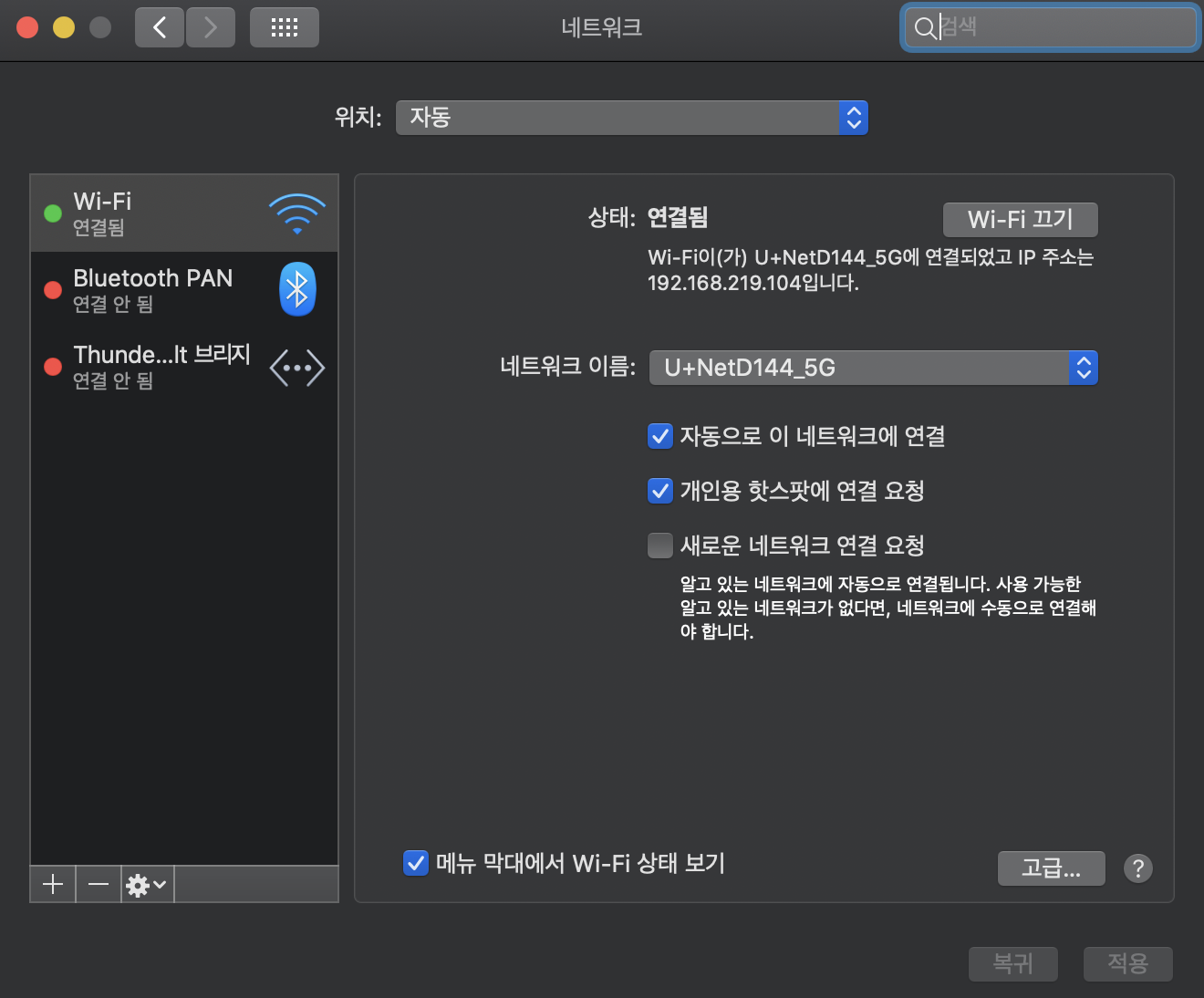 ๋งฅ๋ถ์์ IP ์ฃผ์๋ฅผ ํ์ธํด ๋ณธ ๊ฒฐ๊ณผ C ํด๋์ค์ ์ฌ์ค IP ์ฃผ์๋ก ํ ๋น๋ ๊ฒ์ ํ์ธํ ์ ์์ต๋๋ค.