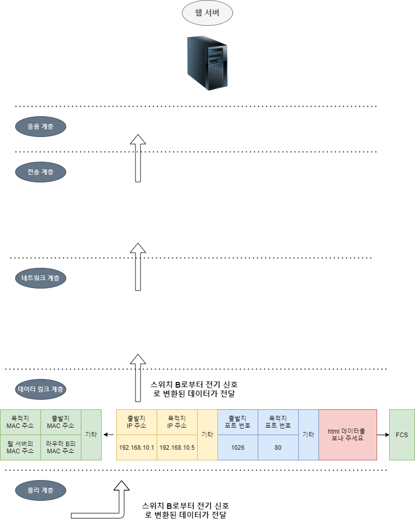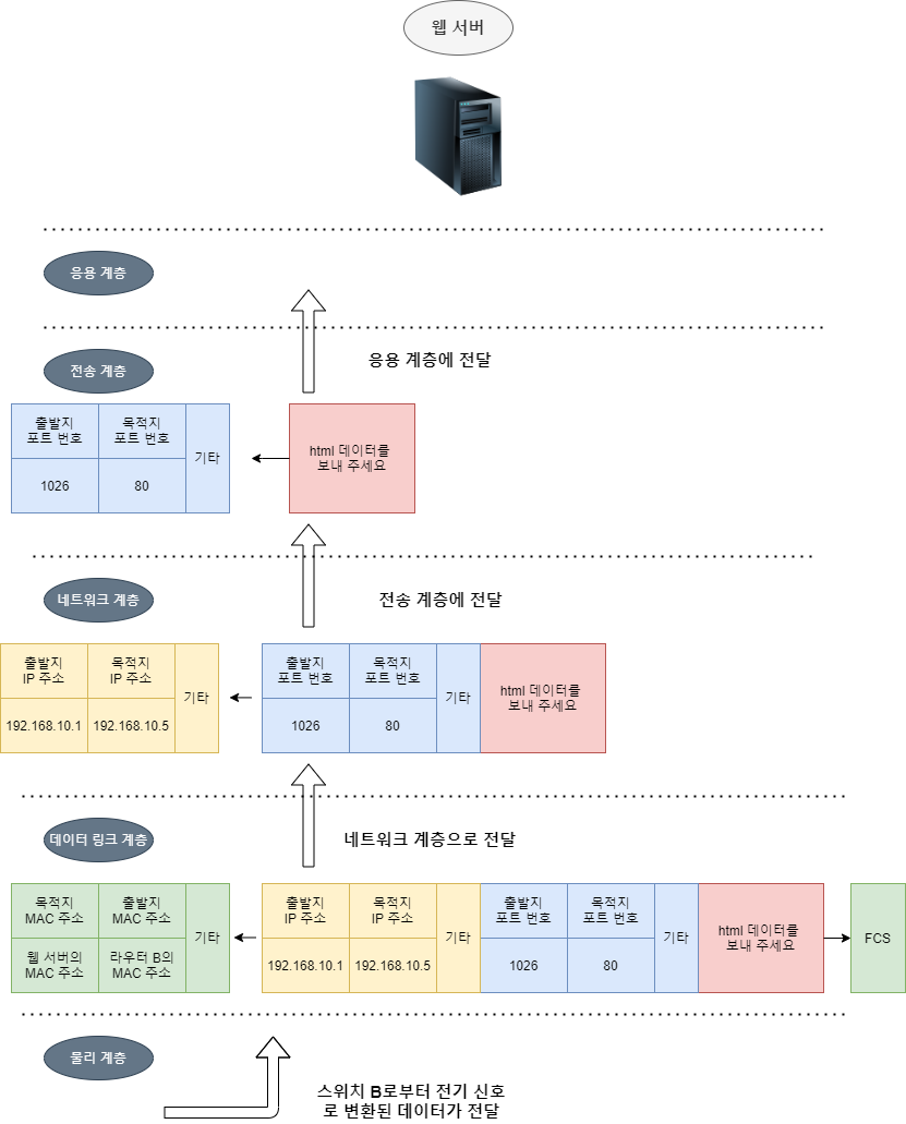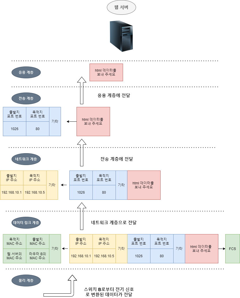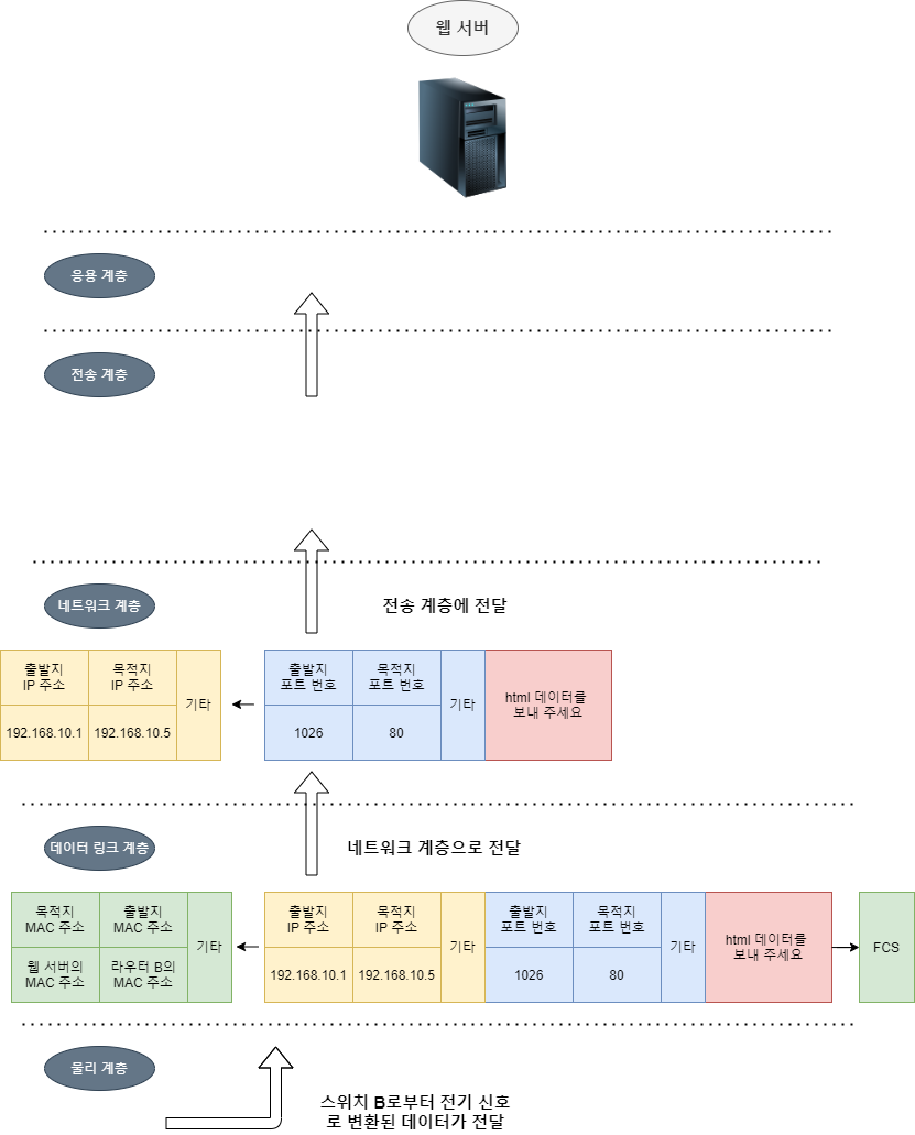 ๊ทธ๋ฆผ๊ณผ ๊ฐ์ด ๋ฐ์ดํฐ๊ฐ ์ ๊ธฐ ์ ํธ๋ก ์น ์๋ฒ์ ๋์ฐฉํ๋ฉด ์น ์๋ฒ๋ ๋ฐ์ดํฐ ๋งํฌ ๊ณ์ธต์์ ์ด๋๋ท ํ๋ ์์ ๋ชฉ์ ์ง MAC ์ฃผ์์ ์์ ์ MAC ์ฃผ์๋ฅผ ๋น๊ตํฉ๋๋ค.