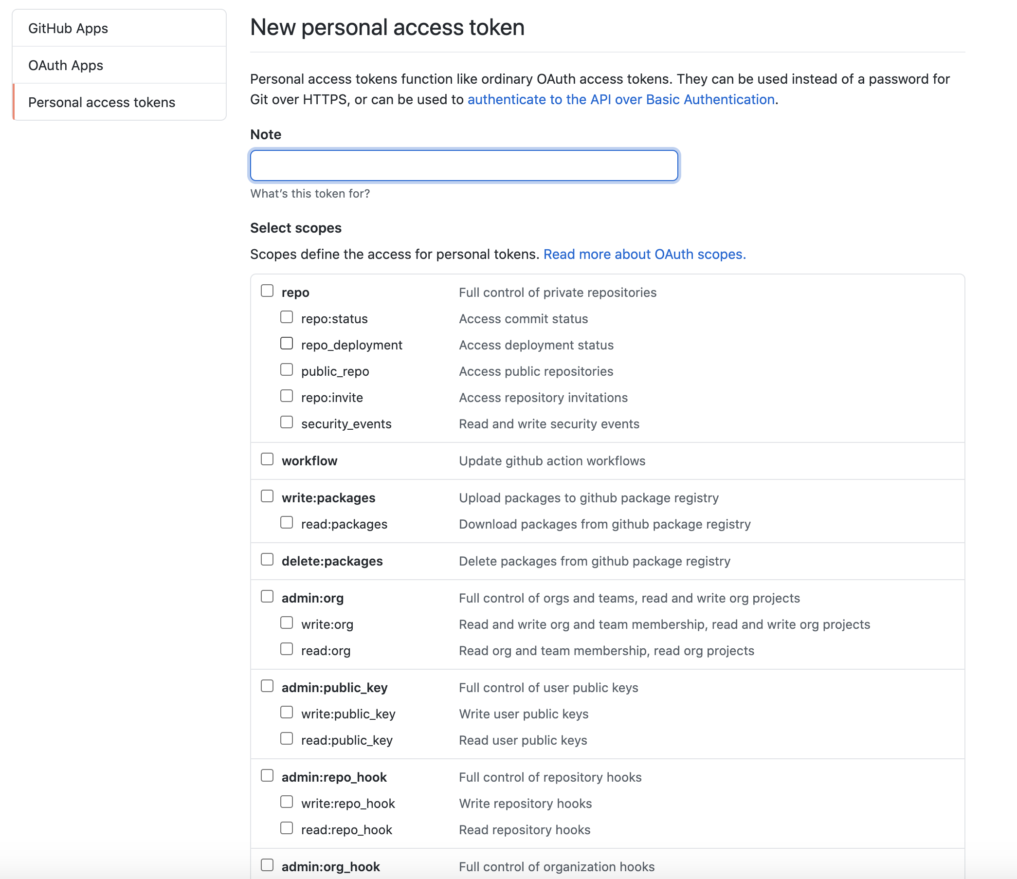 - ๋ฐ์ ๊ทธ๋ฆผ์์ token์ ์ฌ์ฉํ๋ scope๋ฅผ ์ค์ ํฉ๋๋ค. ์ ๋ issues์ comment๋ฅผ ํ์ธํ ๊ฒ์ด๊ธฐ ๋๋ฌธ์ repo๋ง ํด๋ฆญํ๋ฉด ๋ฉ๋๋ค.