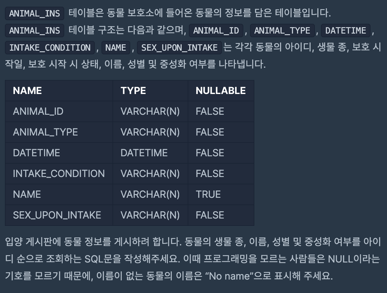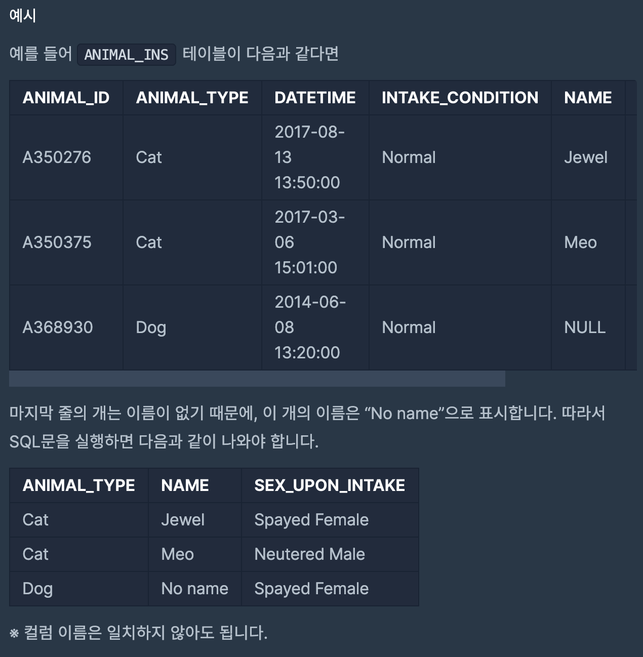 - Programmers의 문제로 저는 Oracle로 풀이를 작성하였습니다.문제예시)