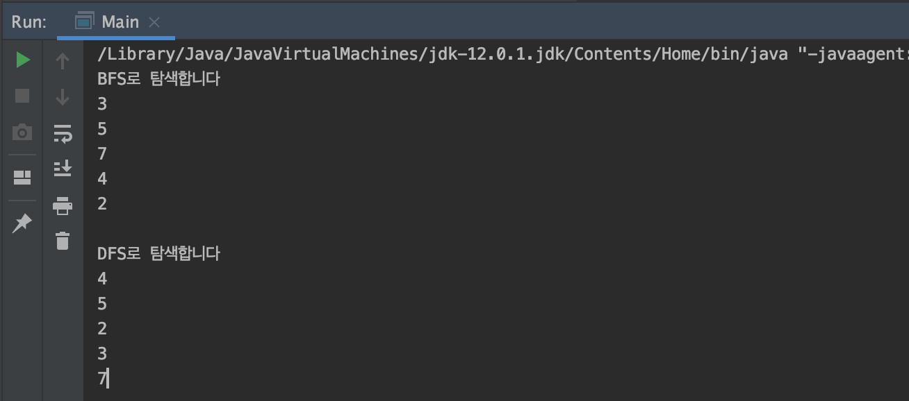public class Main { public static void main(String[] args) { BinaryTree bt = new BinaryTree(); Node node = new Node(3); Node node1 = new Node(5); Node node2 = new Node(7); Node node3 = new Node(4); Node node4 = new Node(2); bt.push(node); bt.push(node1); bt.push(node2); bt.push(node3); bt.push(node4); System.out.println("BFS๋ก ํ์ํฉ๋๋ค"); bt.printBFS(node); System.out.println("\nDFS๋ก ํ์ํฉ๋๋ค"); bt.printDFS(node); } }