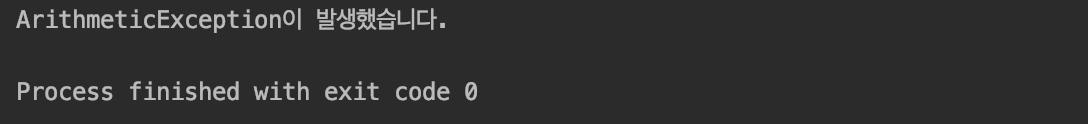 public class ExceptionTest { public static void main(String[] args) { try{ int num = 4/0; System.out.println(num); }catch (ArithmeticException e){ System.out.println("ArithmeticExceptionμ΄ λ°μνμ΅λλ€."); } } }