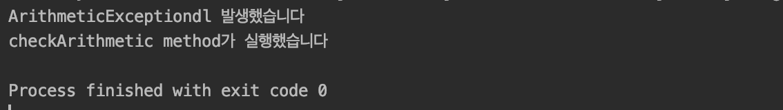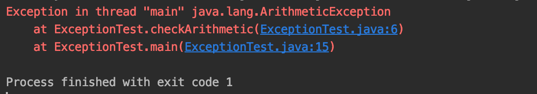 public class ExceptionTest { public void checkArithmetic(int a,int b){ if(b==0){ throw new ArithmeticException(); } System.out.println("checkArithmetic methodκ° μ€ννμ΅λλ€"); System.out.println(a/b); } public static void main(String[] args) { int num = 5; ExceptionTest test = new ExceptionTest(); test.checkArithmetic(num,0); } }