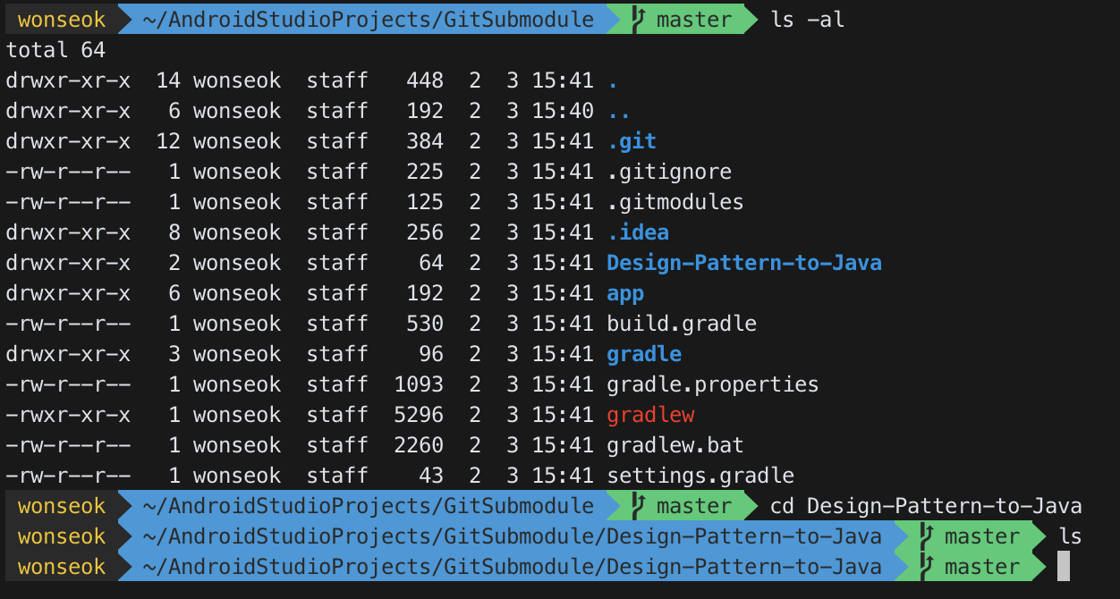 ๋ช ๋ น์ด๋ฅผ ์ ๋ ฅํ ๊ฒฐ๊ณผ .gitmodules์ ์๋ธ๋ชจ๋์ธ Design-Pattern-to-Java ๊ฐ ์ถ๊ฐ๋ ๊ฒ์ ๋ณผ ์ ์์ต๋๋ค.