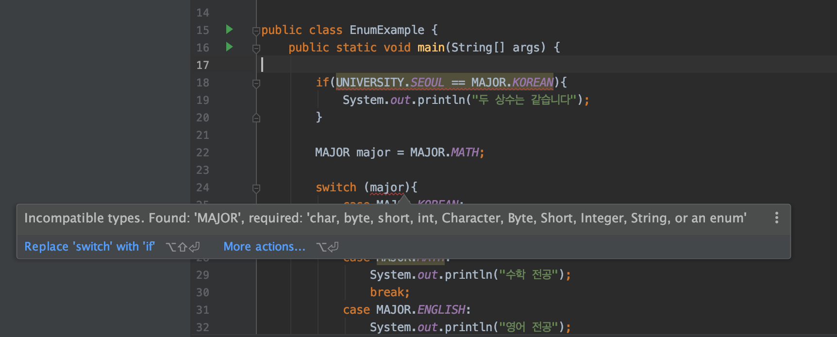 class UNIVERSITY{ public static final UNIVERSITY SEOUL = new UNIVERSITY(); public static final UNIVERSITY YONSEI = new UNIVERSITY(); public static final UNIVERSITY KOREA = new UNIVERSITY(); } class MAJOR{ public static final MAJOR KOREAN = new MAJOR(); public static final MAJOR MATH = new MAJOR(); public static final MAJOR ENGLISH = new MAJOR(); public static final MAJOR SCIENCE = new MAJOR(); } public class EnumExample { public static void main(String[] args) { if(UNIVERSITY.SEOUL == MAJOR.KOREAN){ System.out.println("λ μμλ κ°μ΅λλ€"); } MAJOR major = MAJOR.MATH; switch (major){ case MAJOR.KOREAN: System.out.println("κ΅μ΄ μ 곡"); break; case MAJOR.MATH: System.out.println("μν μ 곡"); break; case MAJOR.ENGLISH: System.out.println("μμ΄ μ 곡"); break; case MAJOR.SCIENCE: System.out.println("κ³Όν μ 곡"); break; } } }λ€μ μ½λλ μΈν°νμ΄μ€λ‘ μμ±ν λΆλΆμ ν΄λμ€λ‘ λ³κ²½νμμ΅λλ€. κ° μμμλ μμ μμ μ μΈμ€ν΄μ€ννμ¬ κ°μ ν λΉνμμ΅λλ€. μ΄λ‘ μΈν΄ μμμ§ν©μμ κ° μμλ€μ νμ μ λμΌνλ λ°μ΄ν°λ λ€λ₯΄κ² λ©λλ€. μμλ₯Ό μΈν°νμ΄μ€λ‘ μ μν κ²°κ³Όμ λ¬λ¦¬ UNIVERSITYμ μμμ MAJOR μμλ₯Ό λΉκ΅ν κ²½μ° μλ‘ λ€λ₯Έ λ°μ΄ν° νμ λΌλ¦¬ λΉκ΅ν μ μλ€λ λ©μμ§μ ν¨κ» μ»΄νμΌλ¨κ³μ μμΈκ° λ°μν©λλ€. λ°νμμμ λ°μν μ μλ μλ¬λ₯Ό μ»΄νμΌ λ¨κ³μμ 미리 μ μ μκΈ° λλ¬Έμ μ¬μ μ μ°¨λ¨ν μ μλ€λ μ₯μ μ΄ μκ²Όμ΅λλ€.