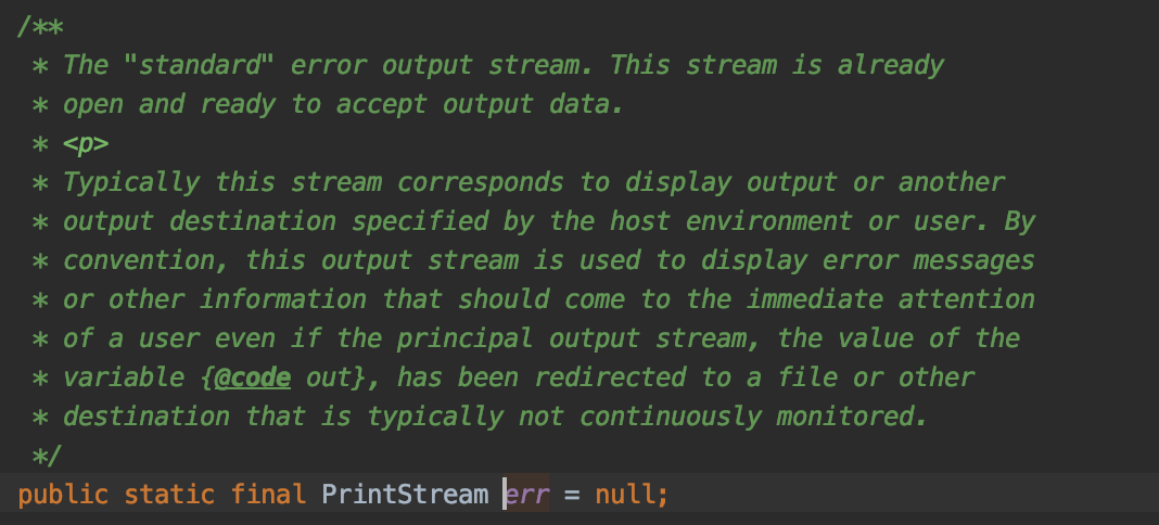 System.err ๋ ํ์ค ์๋ฌ ์ถ๋ ฅ ์ฅ์น๋ก PrintStream ํ์ ์ ํด๋น๋ฉ๋๋ค. ์ผ๋ฐ์ ์ผ๋ก ์๋ฌ๊ฐ ์์ ๊ฒฝ์ฐ๋ System.out๊ณผ ๋์ผํ์ง๋ง, ์๋ฌ๊ฐ ๋ฐ์ํ ๊ฒฝ์ฐ ์ ๋ฌํด์ผํ ๋ด์ฉ์ System.err๋ก ๋๊ฐ๋๋ค.