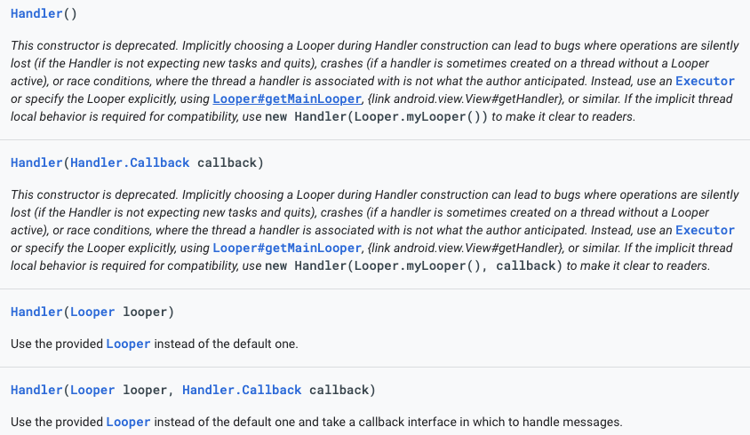 https://developer.android.com/reference/android/os/Handler ์๋๋ Handler์ ๊ธฐ๋ณธ ์์ฑ์๋ 4๊ฐ๋ก ์ ์๋์ด ์์์ง๋ง, ์ฌ๋ฌ๊ฐ์ง ๋ฒ๊ทธ๋ค๋ก ์ธํ์ฌ ์๋ 2๊ฐ์ ์์ฑ์ ์ฆ Looper๋ฅผ ๋งค๊ฐ๋ณ์๋ก ๋ฐ๊ณ Looper์ Callback์ ๋งค๊ฐ๋ณ์๋ก ๋ฐ๋ ์์ฑ์๋ง ์ฌ์ฉ๊ฐ๋ฅํฉ๋๋ค.