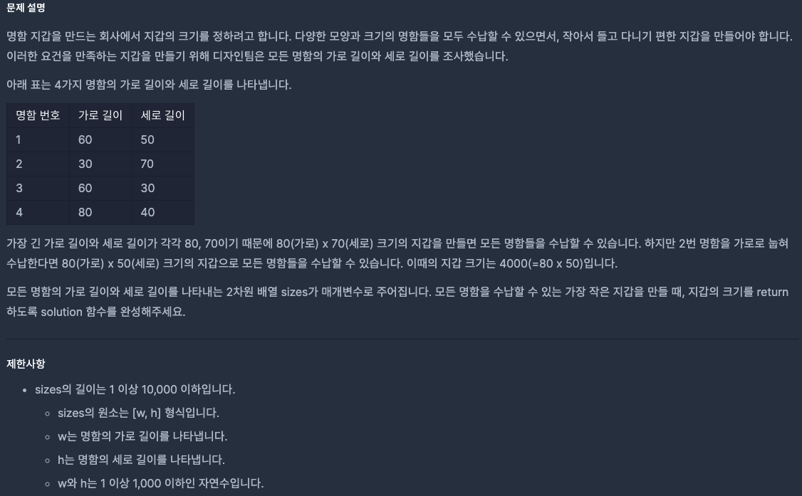 import kotlin.math.* class Solution { fun solution(sizes: Array<IntArray>): Int { var answer: Int = 0 var y = 0 var x = 0 for(arr in sizes){ var first = max(y,arr[0])*max(x,arr[1]) var second = max(y,arr[1])*max(x,arr[0]) if(first > second){ answer = second y = max(y,arr[1]) x = max(x,arr[0]) }else{ answer = first y = max(y,arr[0]) x = max(x,arr[1]) } } return answer } }- ๊ตณ์ด ์ ์ฒ๋ผ ๊ตฌํํ์ง ์๊ณ sizes ๋ฐฐ์ด์์ ํ๋์ฉ ํ์ ์ arr๋ฅผ ์ ๋ ฌํ ๋ค first๋ ์ฒซ ๋ฒ์งธ ๊ฐ๋ค ์ค ์ต๋๊ฐ, second๋ ๋ ๋ฒ์งธ ๊ฐ๋ค ์ค ์ต๋๊ฐ์ ๊ตฌํ๋ฉด ๋ฉ๋๋ค. first์ second๋ฅผ ๊ณฑํ ๊ฐ์ด ๋ต์ด ๋ฉ๋๋ค.