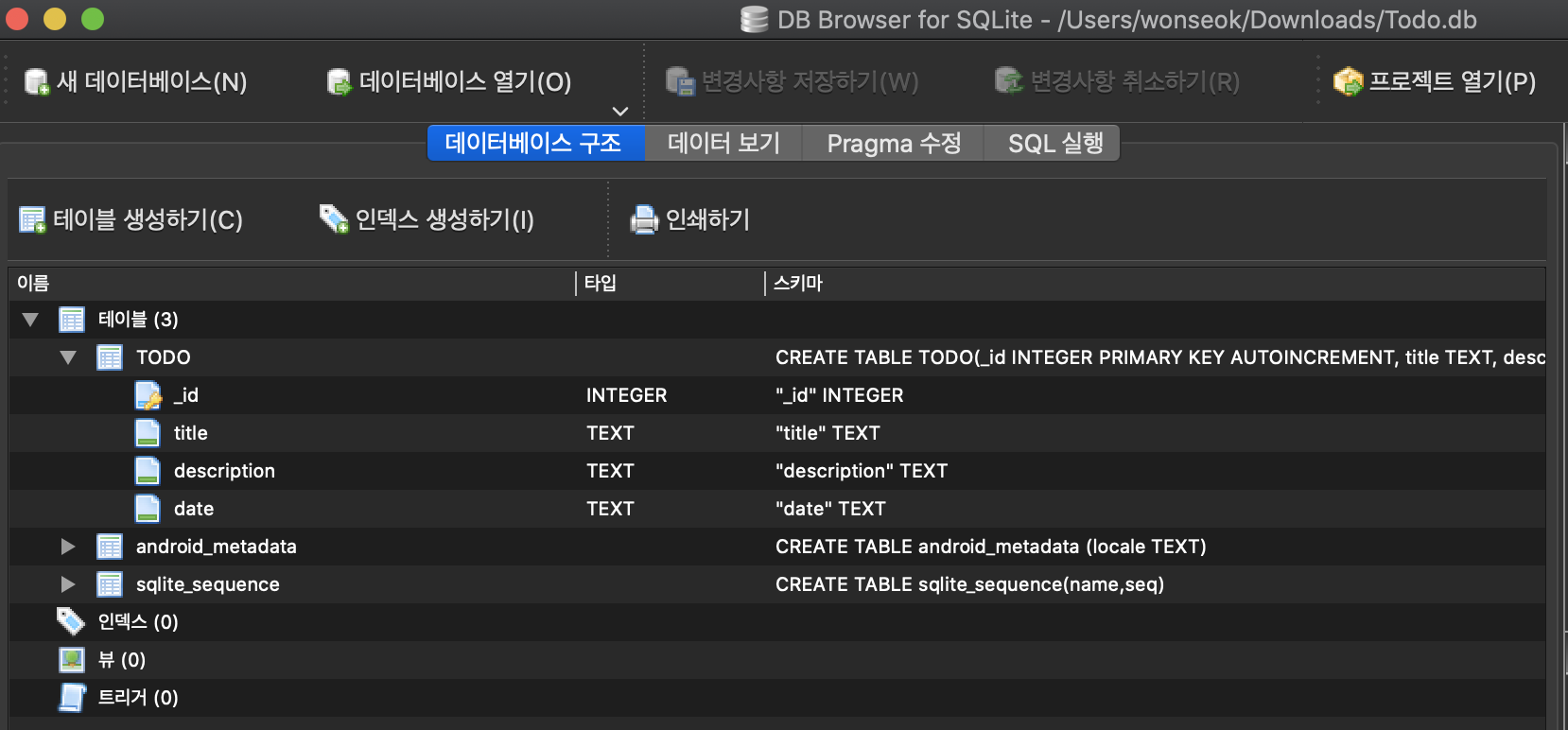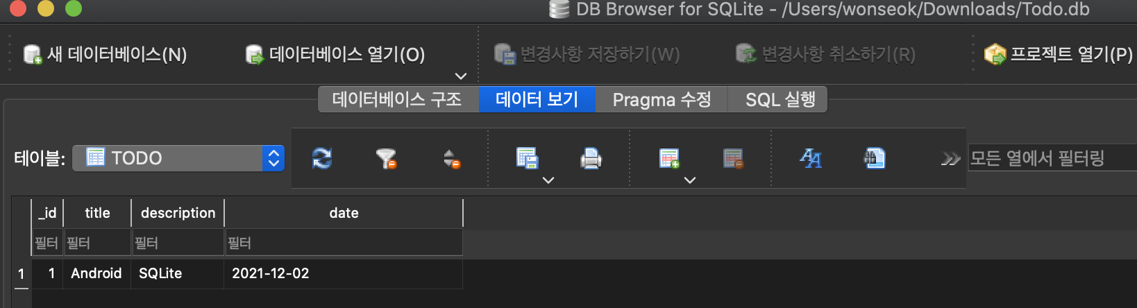 ์ค์น ํ ์คํํ์ฌ ํด๋น DB ํ์ผ์ ์ด๋ฉด ๋ค์๊ณผ ๊ฐ์ด DB ๋ด ํ ์ด๋ธ์ ํ์ธํ ์ ์์ต๋๋ค. ๋ฐ์ดํฐ ๋ณด๊ธฐ ํญ์์๋ ํ ์ด๋ธ ๋ด ์ ์ฅ๋ ๋ฐ์ดํฐ๋ค๋ ํ์ธ์ด ๊ฐ๋ฅํฉ๋๋ค. ์ญ์ ๋ ๋์ผํ๊ฒ DROP TABLE ์ ์ฌ์ฉํ์ฌ execSQL ๋ฉ์๋๋ก ์คํํ๋ฉด ํ ์ด๋ธ ์ญ์ ๊ฐ ๋ฉ๋๋ค.