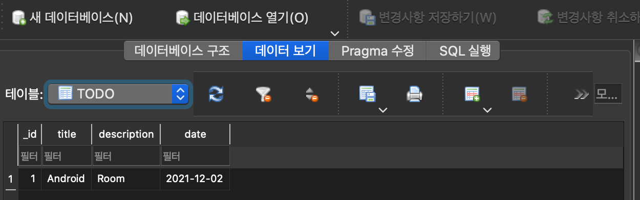 private fun updateTodoData(position: Int) { ... Thread { var sql = "UPDATE $TABLE_NAME SET " + "$COLUMN_TITLE = '$title', " + "$COLUMN_DESCRIPTION = '$description', " + "$COLUMN_DATE = '$date' " + "WHERE $_ID = $position" Log.d(TAG, sql) db.execSQL(sql) updateRecyclerView() }.start() ... }Update๋ ๋์ผํ๊ฒ Dialog๊ฐ ๋ํ๋์ Title, Description, Date๋ฅผ ๋ฐ์์ ๋ณ๊ฒฝํ๋๋ก ํ์์ต๋๋ค. primary key๊ฐ _ID์ด๊ธฐ ๋๋ฌธ์ ์กฐ๊ฑด๋ฌธ์ผ๋ก ๋ณ๊ฒฝํ๊ณ ์ถ์ ID๋ก ํํฐ๋ฅผ ๊ฑธ์ด SQL๋ฌธ์ ์์ฑํฉ๋๋ค. ๊ธฐ์กด์ ๋ฐ์ดํฐ๊ฐ Title = Android, Description = SQLite, Date = 2021-12-02 ๋ก ์ ์ฅ๋์ด ์์ผ๋, SQLite์์ Room์ผ๋ก ๋ณ๊ฒฝํ์ฌ ์ ๋ฐ์ดํธ ํ์์ต๋๋ค.