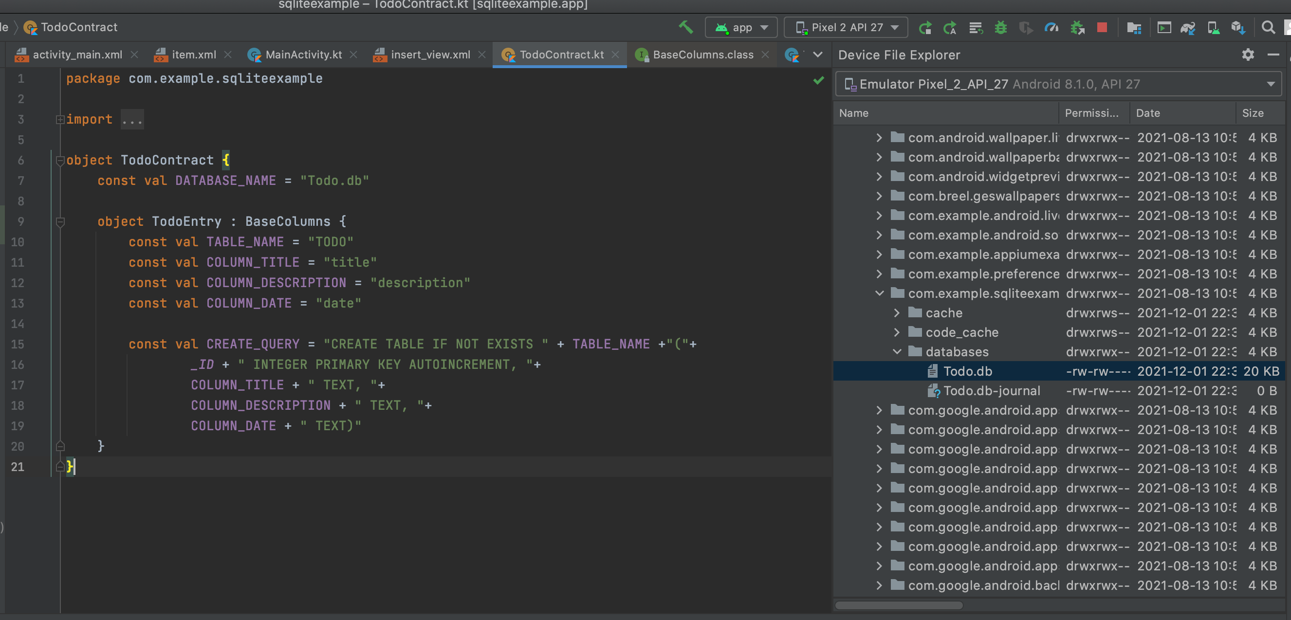 object TodoContract { const val DATABASE_NAME = "Todo.db" object TodoEntry : BaseColumns { const val TABLE_NAME = "TODO" const val COLUMN_TITLE = "title" const val COLUMN_DESCRIPTION = "description" const val COLUMN_DATE = "date" const val CREATE_QUERY = "CREATE TABLE IF NOT EXISTS $TABLE_NAME (" + "$_ID INTEGER PRIMARY KEY AUTOINCREMENT, " + "$COLUMN_TITLE TEXT, " + "$COLUMN_DESCRIPTION TEXT, " + "$COLUMN_DATE TEXT)" const val DROP_QUERY = "DROP TABLE IF EXISTS $TABLE_NAME" } }TodoContract ์ค๋ธ์ ํธ๋ฅผ ์์ฑํ๊ณ TodoEntry๋ ํ๋์ ํ ์ด๋ธ ์ ์ํ๋๋ฐ ํ์ํ ์์๋ค์ ์ ์ธํ๊ณ ์์ต๋๋ค. ์ด์ฒ๋ผ ์คํค๋ง๋ฅผ ์์ฑํ ๋๋ ์ ์ฒด ๋ฐ์ดํฐ๋ฒ ์ด์ค ๋ ์ด์์ ์ญํ ์ ํ๋ Contract ์ค๋ธ์ ํธ๋ฅผ ์์ฑํ๊ณ ๊ฐ ํ ์ด๋ธ๋ง๋ค Entry ์ค๋ธ์ ํธ๋ฅผ ์์ฑํ์ฌ ๋์ผ ํจํค์ง์ ๋ชจ๋ ํด๋์ค์์ ์ฌ์ฉํ ์ ์๋๋ก ํฉ๋๋ค.