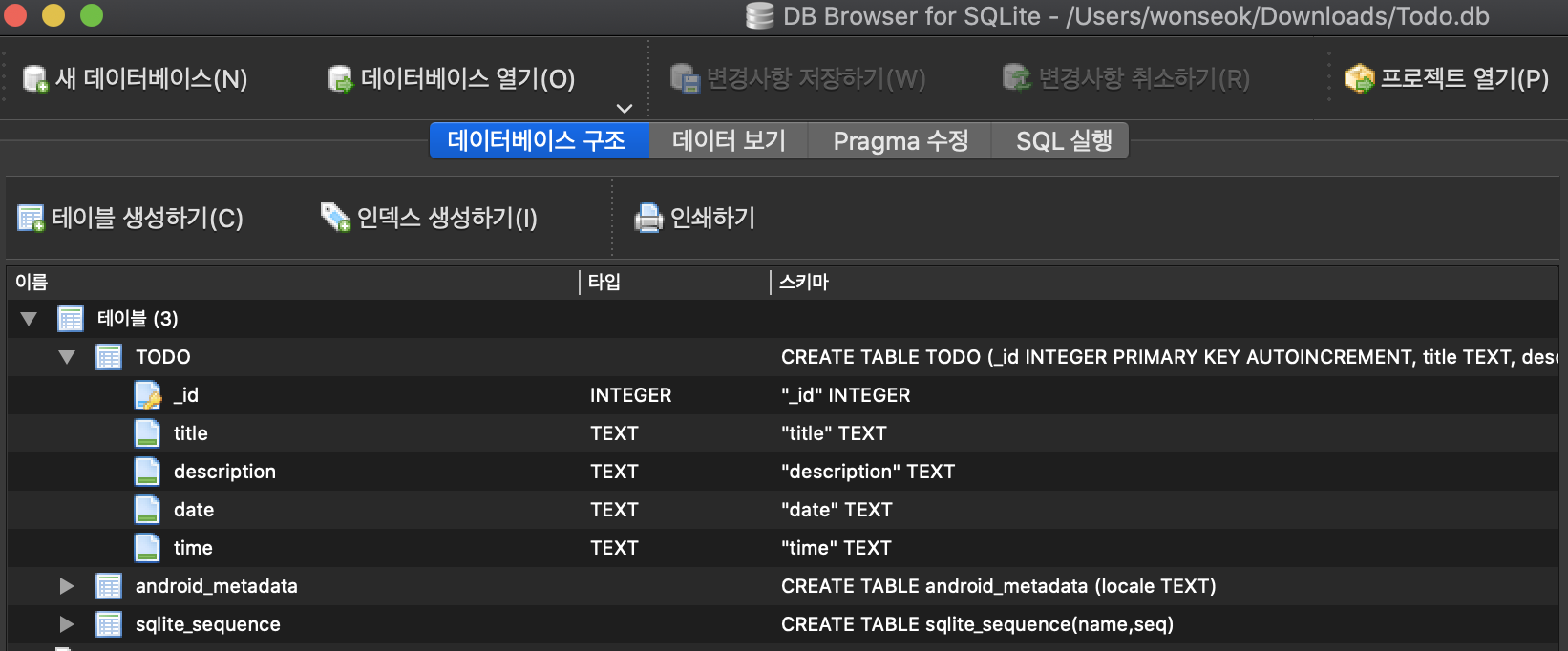 DB ํ์ผ์ ์ ์์ ์ผ๋ก ์์ฑ๋๋ ๊ฒ์ ์ ์ ์์ต๋๋ค. primary key์ ํด๋นํ๋ _id ํ๋๋ autoincrement ํด๋์ด 1๋ถํฐ ์์ํ์ฌ ์๋์ผ๋ก ๋ฐ์ดํฐ๋ฅผ ์ถ๊ฐํ ๋๋ง๋ค 1์ฉ ์ฆ๊ฐํ์ฌ ์ถ๊ฐ๊ฐ ๋ฉ๋๋ค.