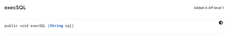 https://developer.android.com/reference/android/database/sqlite/SQLiteDatabase#execSQL(java.lang.String) SQLiteDatabase๊ฐ์ฒด์์ ์ค์ํ ๋ฉ์๋๋ก execSQL๊ฐ ์์ต๋๋ค. execSQL์ ๋ฐ์ดํฐ๋ฒ ์ด์ค๋ฅผ ๋ง๋ ํ์ ํ์ค SQL๋ฅผ ์ฌ์ฉํ ์ ์๋๋ก ํฉ๋๋ค. ํ์ง๋ง ๋ฆฌํด ๊ฐ์ด void์ด๊ธฐ ๋๋ฌธ์ SELECT ๊ตฌ๋ฌธ๊ณผ ๊ฐ์ ๋ฐํ ๊ฐ์ด ์กด์ฌํ๋ SQL๋ฅผ ์ฌ์ฉํ ์ ์์ต๋๋ค.