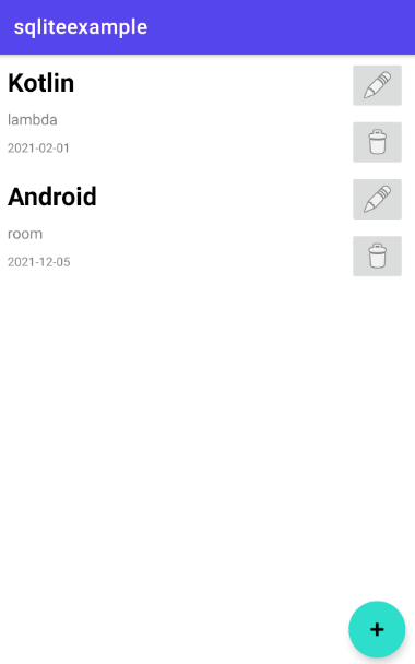 private fun updateRecyclerView() { if(db == null) return todoAdapter.clear() Thread { val list = mutableListOf<Todo>() val sql = "select * from ${TABLE_NAME}" val cursor = db.rawQuery(sql, null) while (cursor.moveToNext()) { list.add( Todo( cursor.getString(1), cursor.getString(2), cursor.getString(3) ) ) } todoAdapter.addAll(list) runOnUiThread { todoAdapter.notifyDataSetChanged() } }.start() }๋ฐ์ดํฐ๋ฅผ ์กฐํํ๊ธฐ ์ํด์๋ SELECT๋ก ์์ํ๋ SQL๋ฌธ์ ์ฌ์ฉํ๊ฒ ๋๋๋ฐ ์ด์ ์๋ execSQL ๋ฉ์๋๋ฅผ ์ฌ์ฉํ์ง๋ง, ๋ฐ์ดํฐ ์กฐํ๋ ๊ฒฐ๊ณผ๋ฅผ ๋ฐ์์ผ ํ๊ธฐ ๋๋ฌธ์ rawQuery๋ผ๋ ๋ฉ์๋๋ฅผ ์ฌ์ฉํด์ผ ํฉ๋๋ค.