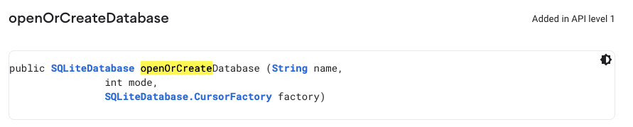 ๋จผ์ ๋ฐ์ดํฐ๋ฒ ์ด์ค๋ฅผ ๋ง๋ค๊ธฐ ์ํ API๋ ContextWrapper ํด๋์ค์ ์๋ openOrCreateDatabase ํจ์์ ๋๋ค.