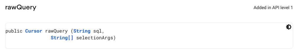 private fun updateRecyclerView() { if(db == null) return todoAdapter.clear() Thread { val list = mutableListOf<Todo>() val projection = arrayOf(COLUMN_TITLE, COLUMN_DESCRIPTION, COLUMN_DATE) val sortOrder = "$_ID ASC" val cursor = db?.query( TABLE_NAME, projection, null, null, null, null, sortOrder ) while (cursor.moveToNext()) { list.add( Todo( cursor.getString(0), cursor.getString(1), cursor.getString(2) ) ) } todoAdapter.addAll(list) runOnUiThread { todoAdapter.notifyDataSetChanged() } }.start() }๋ฐ์ดํฐ๋ฅผ ์กฐํํ๋ ๋ฐฉ๋ฒ๋ query ๋ผ๋ ๋ฉ์๋๋ฅผ ์ด์ฉํ๋ฉด ์ฝ๊ฒ Cursor ๊ตฌํ์ฒด๋ฅผ ๋ฐํ๋ฐ์ ์ ์์ต๋๋ค. projection์ ์กฐํํ๋ ค๊ณ ํ๋ ์ปฌ๋ผ๋ค์ ๋ฐฐ์ด๋ก ์ ์ํ๊ณ , ๊ทธ ์ธ selection, selectionArg, groupBy, having, orderBy ๋ฑ ๋ค์ํ๊ฒ ์กฐ๊ฑด์ ์ค์ ํ ์ ์์ต๋๋ค. ์ ๋ ์ ์ฒด์ ๊ฐ๋ค์ ์กฐํํ๋ ค๊ณ selection๊ณผ selectionArg ๊ฐ์ null์ ๋์ ํ์์ต๋๋ค. ์ญ์๋ ์์ธํ ๊ฑด ๊ณต์๋ฌธ์์ ์ ๋์์์ต๋๋ค.