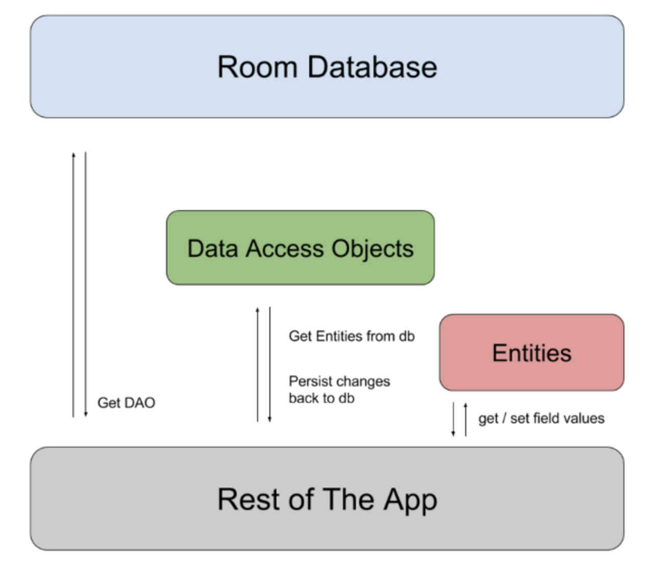 https://developer.android.com/training/data-storage/room?hl=ko ๋ฐ์ดํฐ๋ฒ ์ด์ค ํด๋์ค๋ ๋ฐ์ดํฐ๋ฒ ์ด์ค์ ์ฐ๊ด๋ DAO ์ธ์คํด์ค๋ฅผ ์ฑ์ ์ ๊ณตํฉ๋๋ค. ์ดํ ์ฑ์ DAO๋ฅผ ํตํด์ ํ ์ด๋ธ์ ๊ฐ๋ฆฌํค๋ Entity ์ธ์คํด์ค๋ฅผ ๊ฐ์ ธ์ฌ ์ ์์ต๋๋ค. ๊ทธ๋ฆฌ๊ณ ์ฑ์์ Entity ํด๋์ค๋ฅผ ์ด์ฉํ์ฌ ํ ์ด๋ธ ๋ด์ ๋ฐ์ดํฐ๋ฅผ ์ถ๊ฐํ๊ฑฐ๋, ๋ฐ์ดํฐ๋ฅผ ์์ ํฉ๋๋ค.