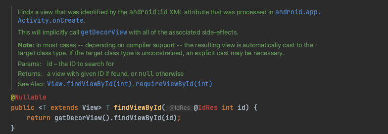 Window.findViewById Activitiy์์ findViewById๋ฅผ ํธ์ถํ๋ฉด ๋ด๋ถ์ ์ผ๋ก Window ํด๋์ค์ findViewById๋ฅผ ํธ์ถํ๊ฒ ๋ฉ๋๋ค. ์ดํ getDecorView์ findViewById๋ฅผ ํธ์ถํฉ๋๋ค.