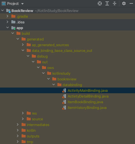 ์ค์ ๋ฐ์ธ๋ฉ ํด๋์ค๋ฅผ ๋ณด๊ณ ์ถ๋ค๋ฉด ์๋๋ก์ด๋ ์คํ๋์ค Android ๋ทฐ์์ Project๋ก ๋ณ๊ฒฝ ํ app > build > ... > databinding ํด๋ ์๋์ ์์ฑ๋๋ ๊ฒ์ ํ์ธํ์ค ์ ์์ต๋๋ค.