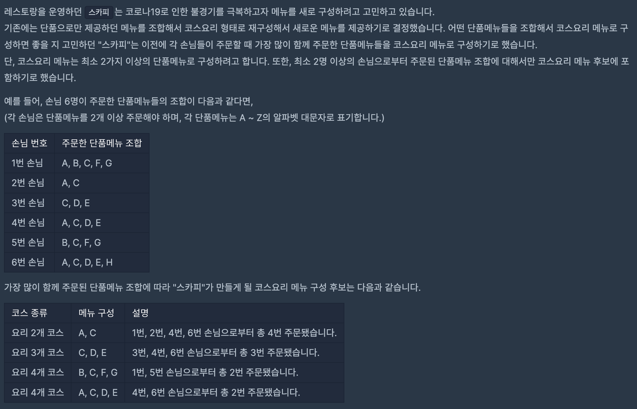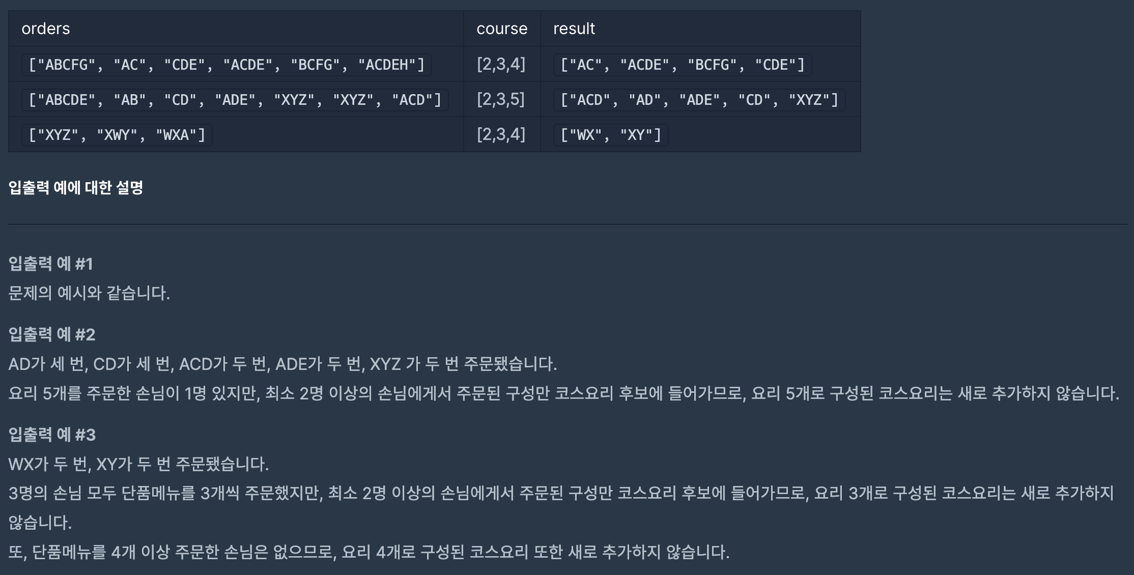 - ์ดํ course ๋ฅผ ํ๋์ฉ ํ์ํ๋ฉด์ ํด๋น ๊ฐฏ์๋ก ๊ตฌ์ฑ๋ ๋ฉ๋ด ์กฐํฉ ์ค 2๋ฒ ์ด์ ์ฃผ๋ฌธ๋ ๊ฒ ์ค ์ต๋๊ฐ์ ๊ตฌํฉ๋๋ค. ๊ทธ๋ฆฌ๊ณ ์ต๋๊ฐ๊ณผ ๋์ผํ ๋ฉ๋ด ๊ตฌ์ฑ์ ๋ชจ๋ answer์ ์ถ๊ฐํ์๋ฉด ๋ฉ๋๋ค.