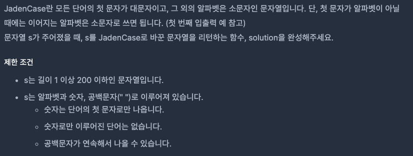class Solution { fun solution(s: String): String { return s.toLowerCase().split(" ").map{ it.firstOrNull()?.let{ first -> it.replaceFirst(first, first.toUpperCase()) } ?: it }.joinToString(" ") } }์ฐธ๊ณ