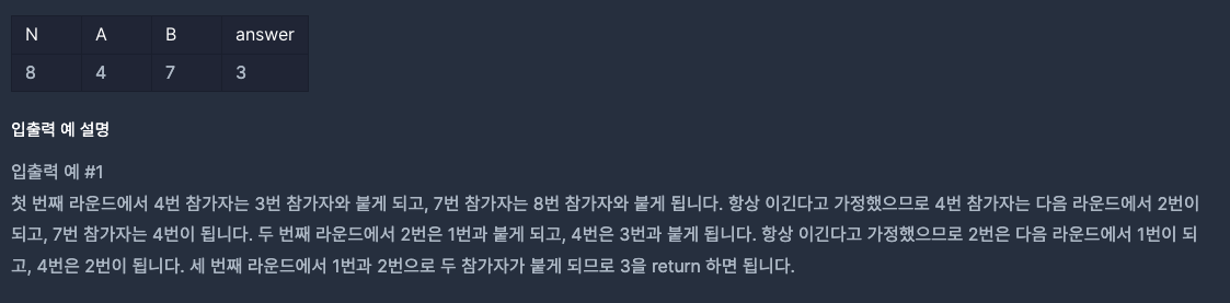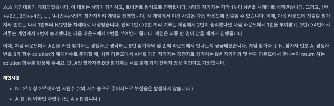 class Solution { fun solution(n: Int, a: Int, b: Int): Int { var answer = 0 var first = if(a>b) b else a var second = if(a>b) a else b while(second - first > 0){ first = first/2 + first%2 second = second/2 + second%2 answer++ } return answer } }