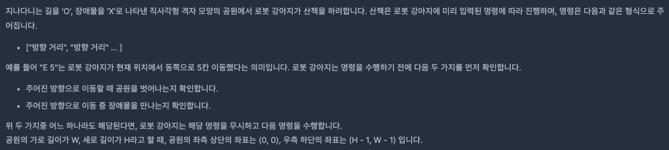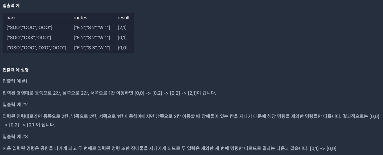 class Solution { val dir = mapOf("E" to (0 to 1), "N" to (-1 to 0), "W" to (0 to -1), "S" to (1 to 0)) fun isInside(a: Int, b: Int, y:Int, x: Int) = 0<= a && a< y && 0<=b && b<x fun solution(park: Array<String>, routes: Array<String>): IntArray { var y = park.indexOfFirst{ it.contains("S")} var x = park[y].indexOf("S") routes.forEach{ val input = it.split(" ") var dy = y var dx = x for(i in 0 until input.last().toInt()){ dy += dir[input.first()]!!.first dx += dir[input.first()]!!.second if(isInside(dy, dx, park.size, park[0].length).not()) break if(park[dy][dx] == 'X') break } if(isInside(dy,dx, park.size, park[0].length) && park[dy][dx] != 'X'){ y = dy x = dx } } return intArrayOf(y, x) } }์ฐธ๊ณ