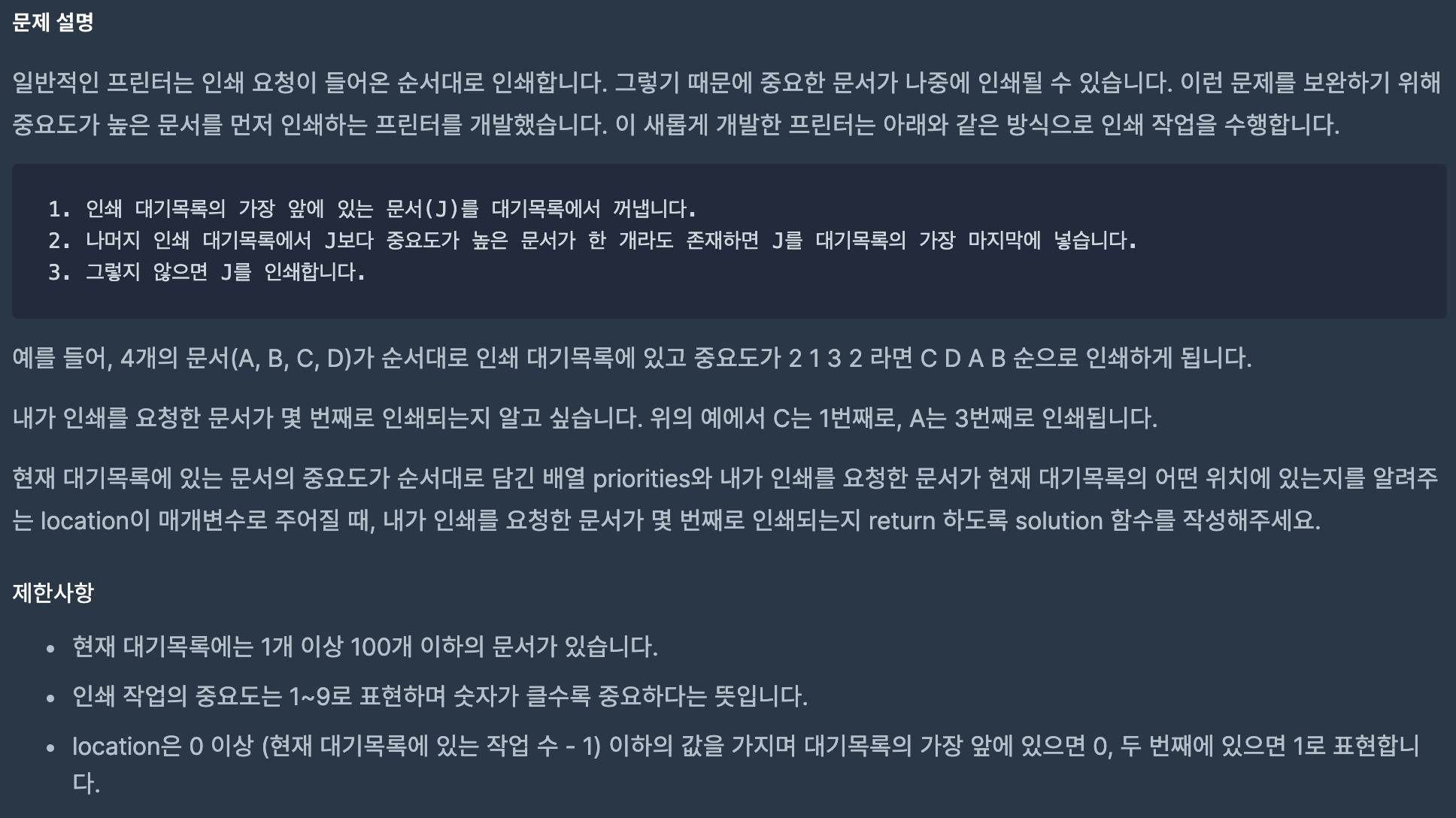 [Programmers] Lv2.ํ๋ฆฐํฐSW Test/Programmers 2020. 3. 26. 00:30๋ฐ์ํ