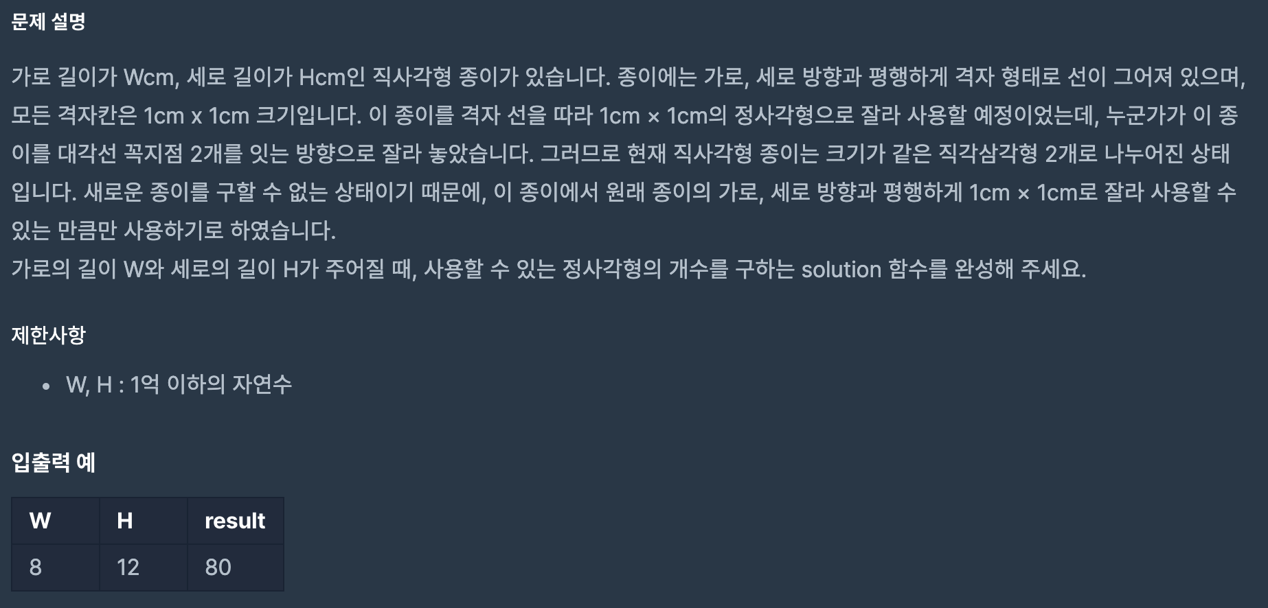 [Programmers] Lv2.๋ฉ์ฉกํ ์ฌ๊ฐํSW Test/Programmers 2020. 3. 26. 19:23๋ฐ์ํ