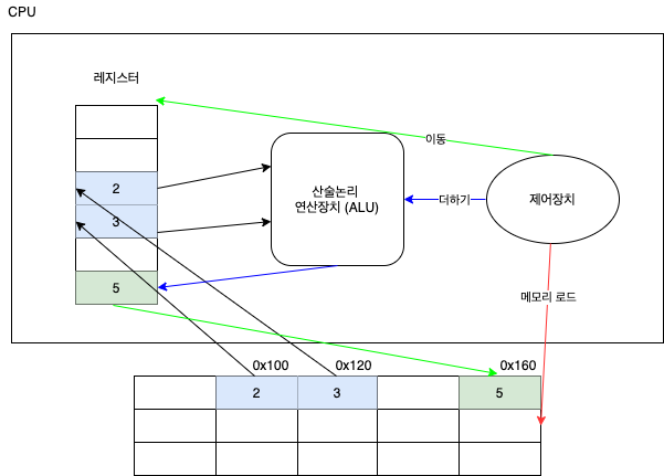 01 LOAD 0x100 r2; 02 LOAD 0x120 r3; 03 ADD r5, r2, r3; 04 MOVE r5, 0x160;01 : ๋ฉ๋ชจ๋ฆฌ 0x100์ ์๋ ๋ฐ์ดํฐ๋ฅผ r2์ ๋ก๋ํ๋ค.