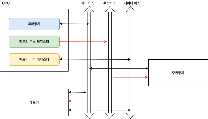 ๋ฐ์ดํฐ ๋ฒ์ค : ๋ฉ๋ชจ๋ฆฌ ๋ฒํผ ๋ ์ง์คํฐ์ ์ฐ๊ฒฐ๋ ๋ฒ์ค๋ก, ๋ฐ์ดํฐ ์ด๋์ด ์๋ฐฉํฅ์ผ๋ก ์ด๋ค์ง๋ค.