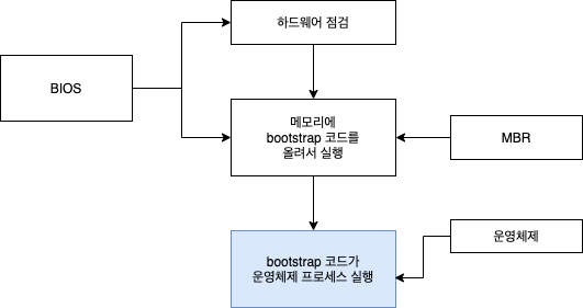 - ์ด์ ์์ ๊ฒฝ์ฐ ํ๋๋์คํฌ์ MRB(Master Boot Record)์ ์ ์ฅ๋ ํ๋ก๊ทธ๋จ์ ๋ฉ๋ชจ๋ฆฌ์ ๊ฐ์ ธ์ ์คํํ๋ค.